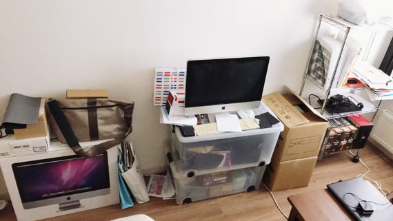 仕事道具であるパソコンが座卓テーブルと衣装ケースに置かれている。窓までの通路を確保するために取りあえず壁際に物を保管している状態。