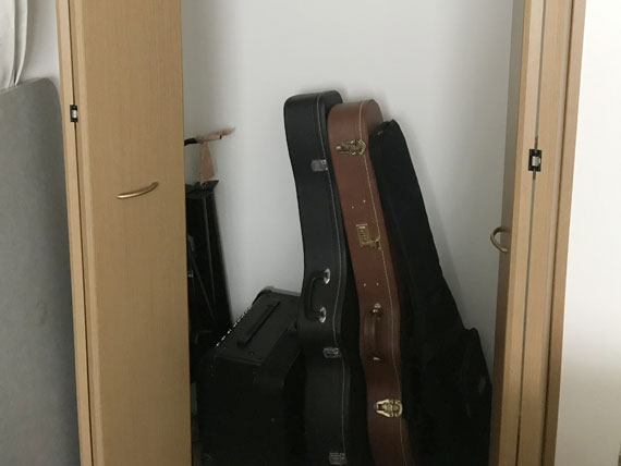 机の板とクローゼットには机のパーツやギター、アンプなどの音楽の機材などご主人様の趣味の物品が収納スペースを占めている。