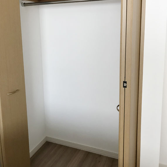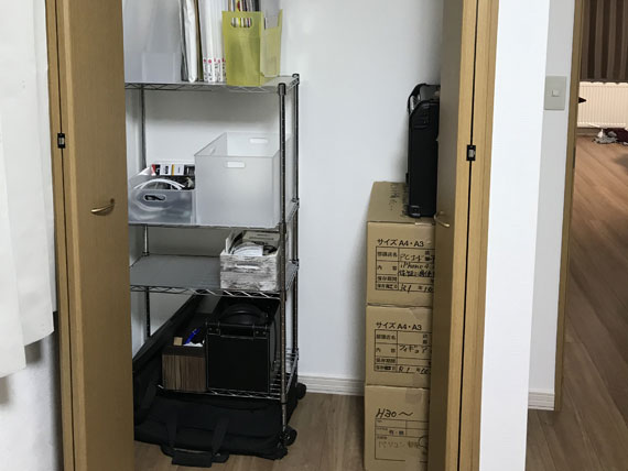 衣装ケースのサイズがクローゼットに入らない大きさの為、部屋に重ねて置いてある。引っ越し当時から開けていない文庫と奥様の思い出の品が入った段ボールが一つずつあり、そのままになっている。