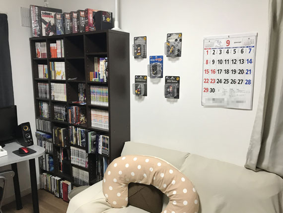 ご主人様と奥様お二人分の本やCDが棚に収納されており、ご主人の趣味のフィギュアが棚上に積み重なって置かれている。